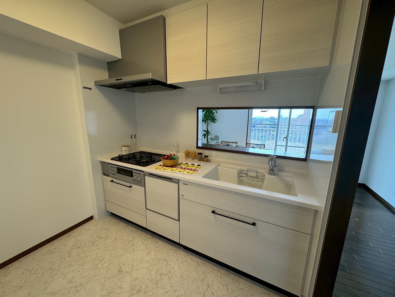 配膳と片付けがらくらく、ハッチのあるキッチン。